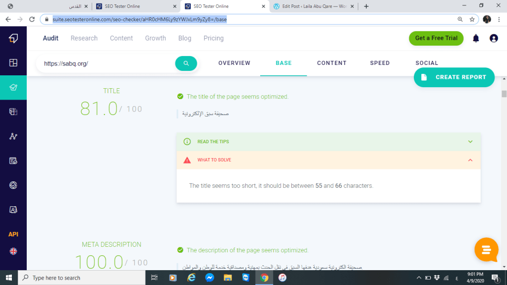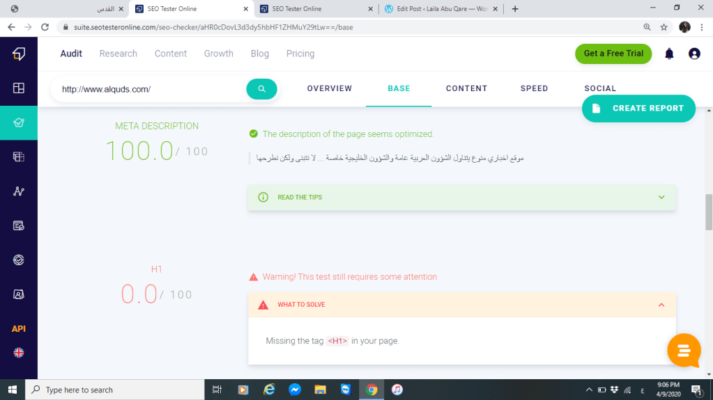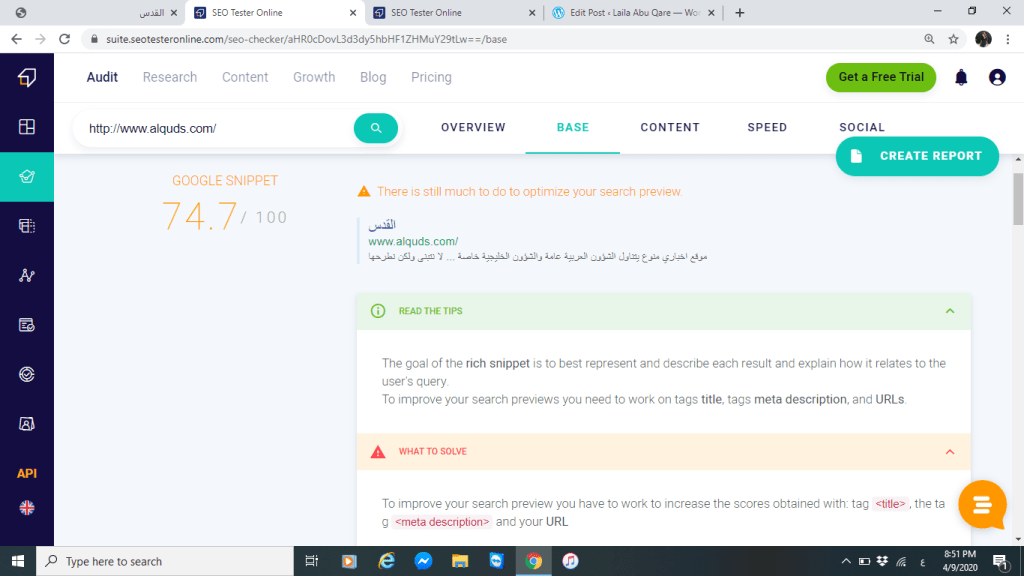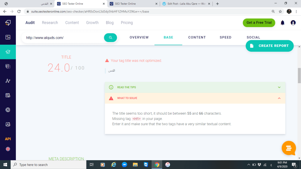 بالاضافة إلى ذلك العنوان أو ما يعرف الموقع عن نفسه أيضا يزيد من نسبة الوصول فتعريف موقع صحيفة القدس كما تصفه وكما تظهره لزائريها ومتابعيها قليل وغير كافي ولا يعطيها بصمة مميزة خصوصا أن اسم الموقع القدس مرتبط بالكثير من المعاني المرتبطة عند ذكر القدس لذلك فقد حصل الوصف على نسبة %74 تقريبا وكان يوجد تحذير من قبل الموقع أي عليها تحسين الوصف