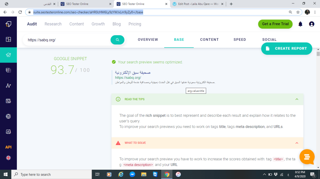 أما عنوان صحيفة السبق كان “صحيفة سبق الالكترونية وحصل العنوان على نسبة %81 فكانت مرضية الى حد على الأقل معطية تفاصيل ولو قليلة ولكن بجاحة أيضا الى التعديل على العنوان