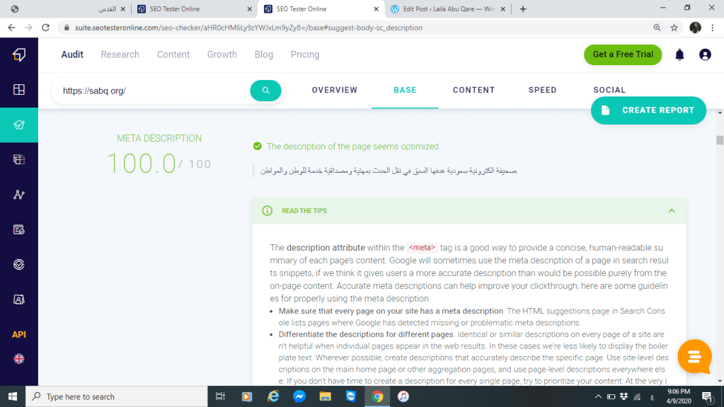 بينما صحيفة سبق السعودية كان تقييم الموقع بنسبة لما تصف موقعها أو تعطي تعريف عام لها كانت بنسبة 94 %تقريبا أي أن كافي ربما من وجهة نظري كان كافي لأن في وصفها عن نفسها بينت وظهرت سبب التسمية للموقع فكانت واضحة لكل من يقرأ التعريف فيربط الاسم بالوصف أي سبق لأن هدفها السبق في نقل الأحداث فكان متناسب الوصف مع اسم الموقع