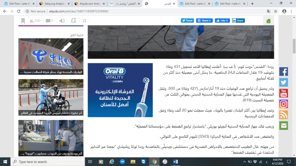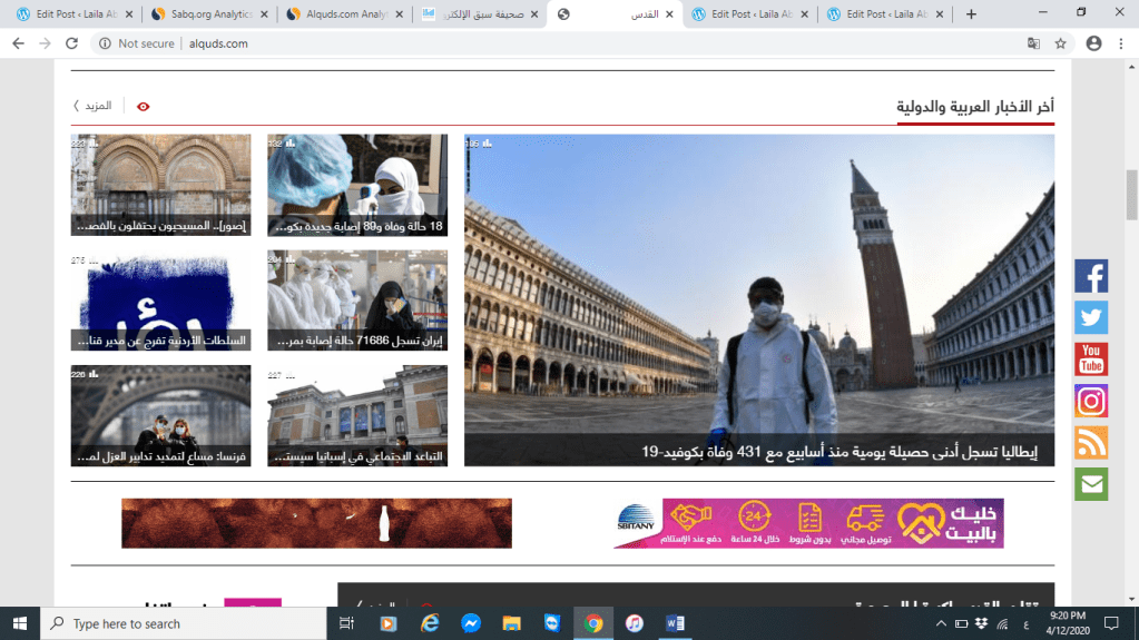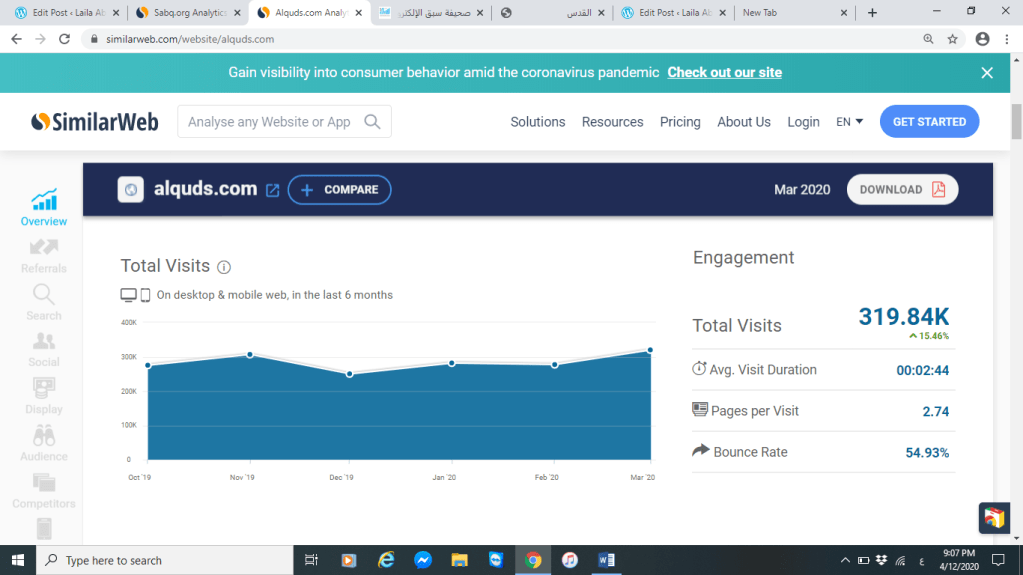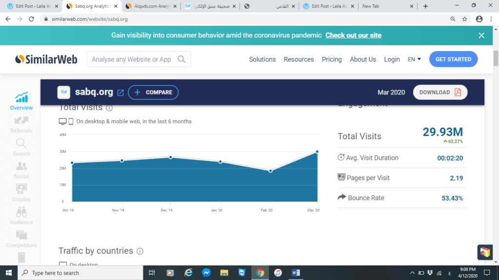 بلغت نسبة الزيارات لموقع صحيفة القدس ما يقارب 320 ألف ومدة البقاء بالموقع تقريبا 3 دقائق فقط على الرغم من صحيفة القدس تم تأسيسها منذ عام 1951 ،أما موقع صحيفة سبق السعودية التي تم تأسيسه عام 2007 فكانت نسبة الزيارات له 30 مليون ولكن يبقون لمدة دقيقتين فقط بالموقع،فالفرق بين نسبة الزيارات لكلا الموقعيين شاسع .