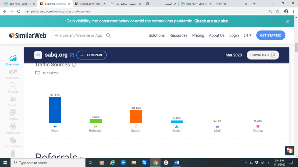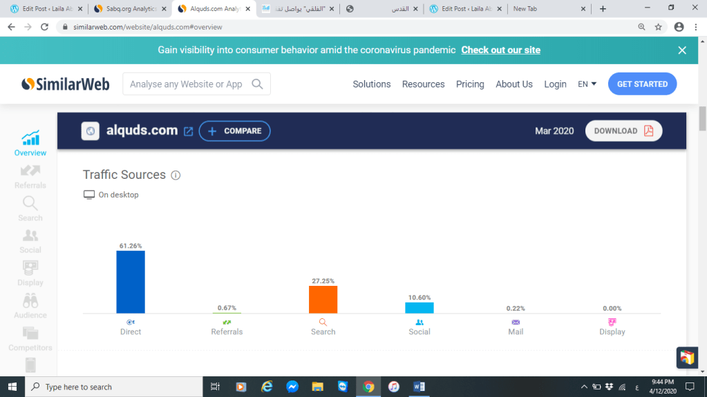 أهم مصدر للوصول هو الدخول المباشر للموقع لأن ذلك يشير إلى أن لديه متابعيين يثقون بمواده الإعلامية فنسبة الدخول بشكل مباشر لموقع صحيفة القدس كانت %61 بالمقابل كان الدخول المباشر لموقع صحيفة سبق تقريبا %58 فرغم من عدد الزيارات الأعلى لموقع صحيفة سبق إلا أن موقع صحيفة القدس يحظى بمتابعة أكبر ف %61 متابعيين للموقع بشكل دائم يخصونه ويقصدوه لمتبعة مواده الإعلامية المختلفة فذلك يشير أن موقع صحيفة القدس يحظى بثقة من قبل متابعينه