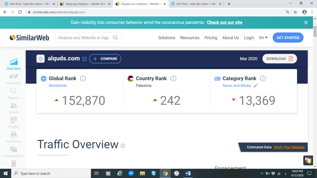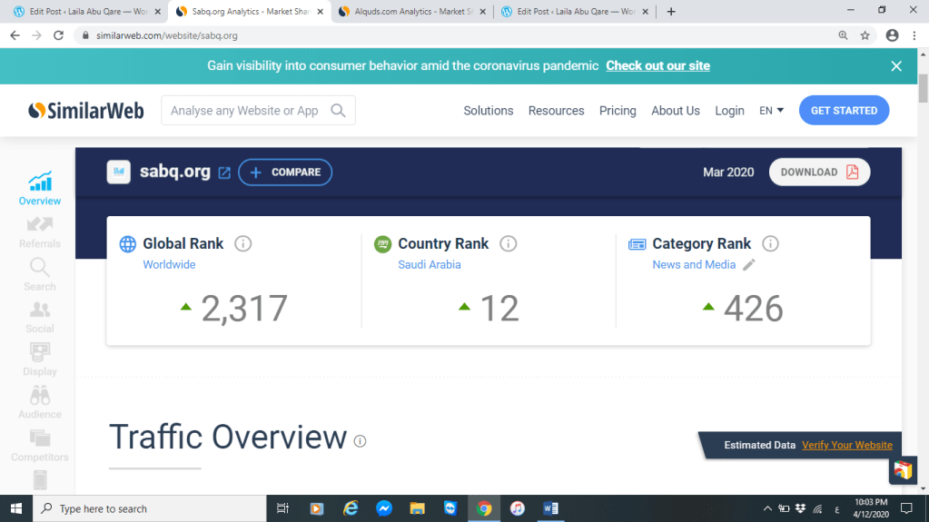 لاحظنا أن نسبة الزيارات لموقع القدس قليلة بالمقارنة مع نسبة الزيارات لموقع سبق السعودية وهذا يعود لأسباب أهمها الالتزام بالكتابة للأونلاين فموقع صحيفة القدس تكتب العناوين ومضمون الأخبار والمقالات كالتي تصدر في الجريدة فهي لا تتبع أساليب الكتابة للأونلاين بالمقارنة مع صحيفة سبق فالعناوين الموجودة بموقعها تعد أفضل بكثير وحتى المضمون نلامس فيها اختلاف كبير عما يكتب بالجريدة